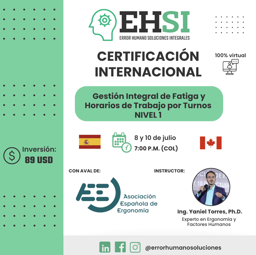A mediados del 2025 tendrá lugar la Certificación Internacional: Gestión Integral de Fatiga y Horarios de Trabajo por Turnos, una formación avalada por la asociación española de ergonomía, que te dará herramientas prácticas para mejorar el desempeño de tu equipo de trabajo.